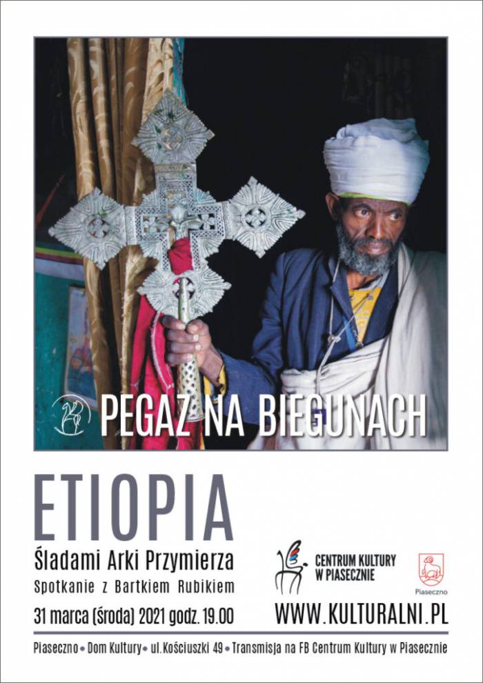 Pegaz na biegunach Etiopia – śladami Arki Przymierza Spotkanie z Bartkiem Rubikiem. 31 marca (środa) 2021 godz. 19.00 Dom Kultury, ul. Kościuszki 49, Piaseczno Transmisja LIVE na FB Centrum Kultury
