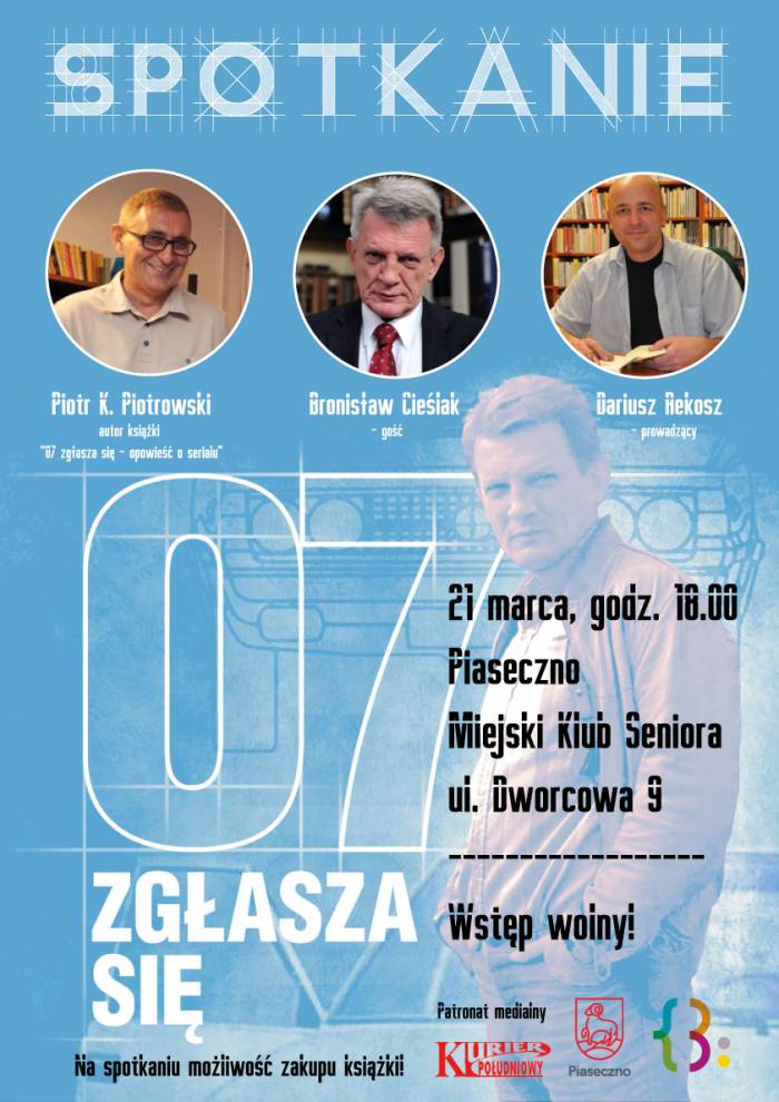 Zapraszamy na spotkanie z Bronisławem Cieślakiem 21 marca o godz. 18:00 w Miejskim Klubie Seniora ul. Dworcowa 9. Spotkanie poprowadzi Dariusz Rekosz i będzie dotyczyło książki 07 zgłasza się autorstwa Piotra K Piotrowskiego.