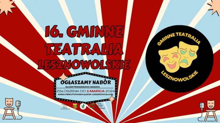 Gminny Ośrodek Kultury w Lesznowoli i Biblioteka Lesznowola zapraszają do udziału w reaktywowanych po 5 latach 16. Gminnych Teatraliach Lesznowolskich. Zapraszamy dziecięce grupy teatralne szkół podstawowych, świetlic i przedszkoli. Przegląd odbędzie się w dniach 18-19 kwietnia 2024 r. w filii GOK Lesznowola w Łazach, ul. Przyszłości 8.
