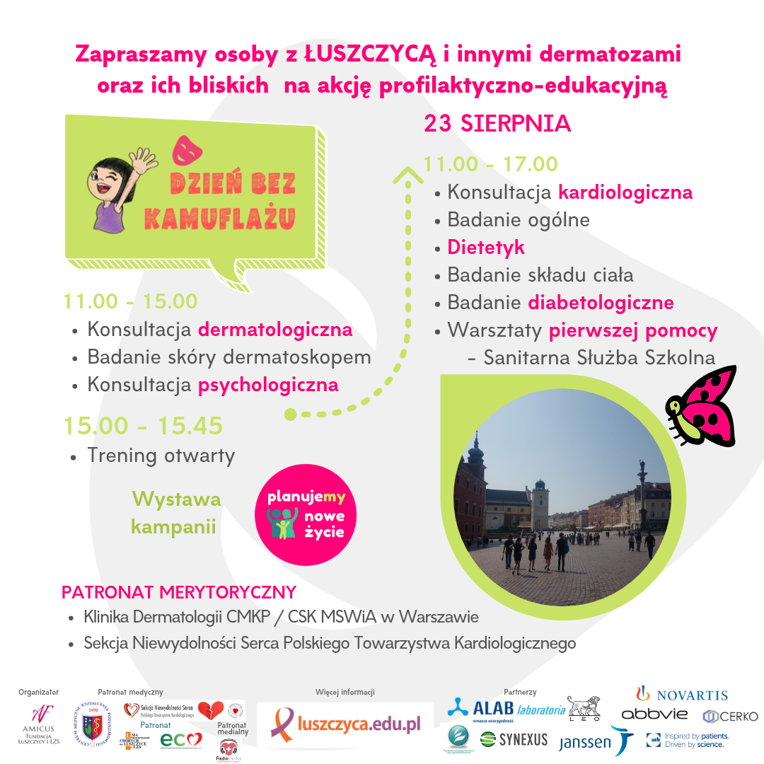 W piątek 23 sierpnia w Warszawie przy Placu Zamkowym, w godz. 11.00 – 17.00 już po raz drugi odbędzie się ogólnopolska, bezpłatna akcja edukacyjno-profilaktyczna DZIEŃ BEZ KAMUFLAŻU, która ma być również zachętą dla chorych na łuszczycę do „zrzucenia” zbędnej w upalne dni odzieży zakrywającej zmiany łuszczycowe.