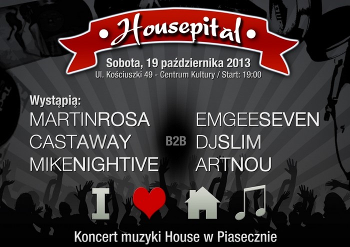 19 października 2013 roku zapraszamy na kolejną edycję Housepital. Housepital jest to projekt, który promuje i daje okazję do imprezowania w kulturalnej atmosferze. Na scenie w sali widowiskowej Centrum Kultury w Piasecznie, położonej przy ulicy Kościuszki 49 będzie miała miejsce impreza klubowa, na której będzie królować muzyka House. Muzycy łączą się w duety i gramy B2B: Martin Rosa b2b Emgee Seven, Mike Nightive b2b Art Nou, Cast Away b2b Slim.