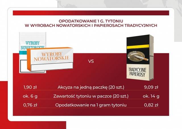 Według niego, wpływy z samej akcyzy do budżetu państwa, w przeliczeniu na 1 gram tytoniu wynoszą 66 groszy w przypadku papierosów i 31 groszy w przypadku wyrobów nowatorskich. Po doliczeniu VAT-u obciążenia wyrobów tytoniowych z tytułu podatków praktycznie wyrównują się.