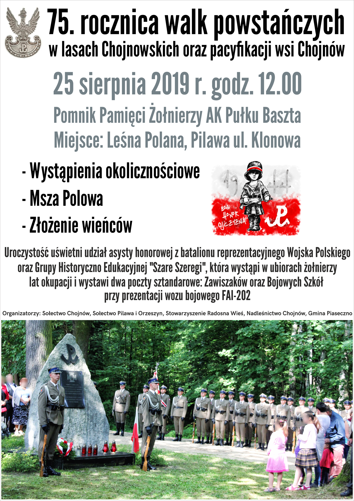 25 sierpnia 2019 roku o godz. 12.00 odbędzie się uroczystość z okazji 75. rocznicy walk powstańczych w lasach Chojnowskich oraz pacyfikacji wsi Chojnów. Miejsce: Leśna Polana, Pilawa ul. Klonowa (Pomnik Pamięci Żołnierzy AK Pułku Baszta).