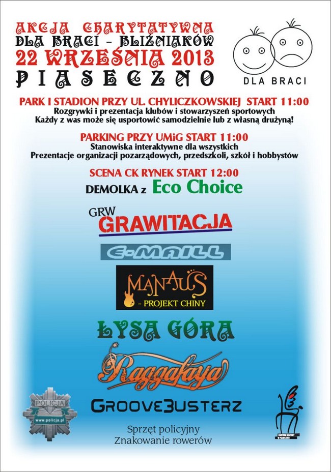 22 września 2013 roku odbędzie się akcja charytatywna Dla Braci, podczas której zbierane będą pieniążki i dary rzeczowe dla 5-letnich chłopców Bartosza i Jakuba. Bracia urodzili się w 2008 roku. W wieku 2 lat zdiagnozowano u nich zaburzenia w rozwoju o podłożu autystycznym z wymaganym wczesnym wspomaganiem rozwoju. Od tej chwili życie rodziny podporządkowane zostało ich potrzebom. Wczesne wykrycie i podjęcie właściwej terapii dają im duże szanse na znalezienie swojego miejsca w dorosłym życiu. Jednak rodzinie brakuje funduszy na zapewnienie niezbędnych form terapii. Zapraszamy na akcję charytatywną w Piasecznie. Szczegóły akcji na plakacie oraz fb: https://www.facebook.com/events/151484308393587/