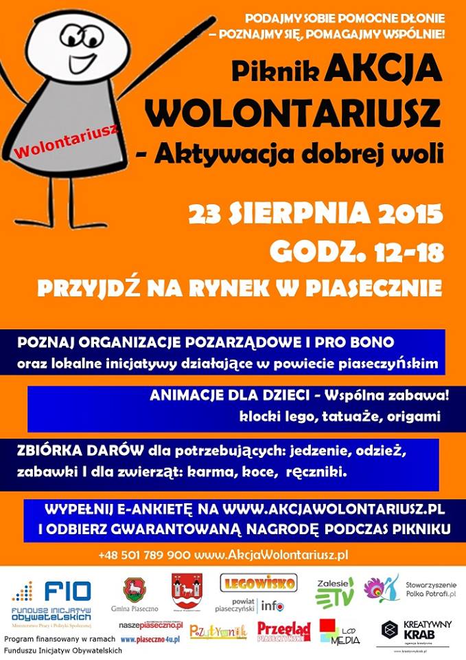 23 sierpnia na rynku w Piasecznie odbędzie się piknik pod nazwą AKCJA WOLONTARIUSZ - Aktywacja Dobrej Woli. Podczas tego wydarzenia mieszkańcy powiatu będą mogli poznać działające na jej terenie stowarzyszenia, fundacje, koła i inne organizacje pozarządowe. W trakcie pikniku odbędą się zbiórki dla biednych, domów dziecka i schronisk dla zwierząt. Będzie również wiele atrakcji dla dzieci, w tym animacje, ale i atrakcje poszczególnych organizacji pozarządowych. Udział w wydarzeniu jest bezpłatny.