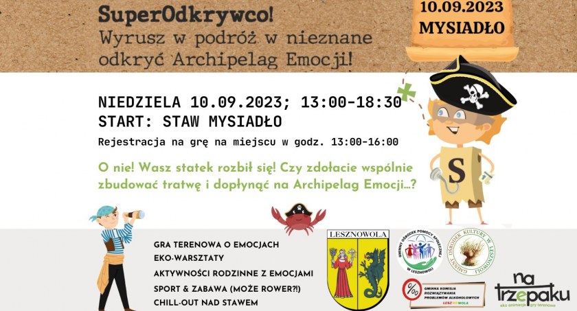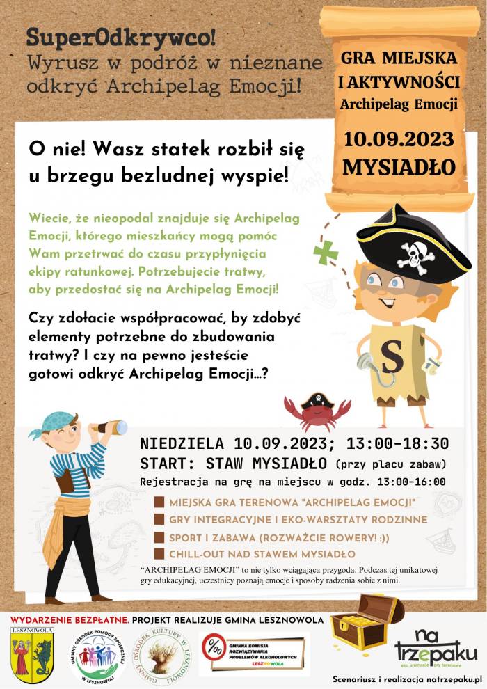 10 września 2023 w godz. 13:00-18:30 zapraszamy rodziców z dziećmi w szczególności w wieku 6-12 lat na edukacyjną grę „Archipelag Emocji“ wokół Stawu i ulicami Mysiadła!