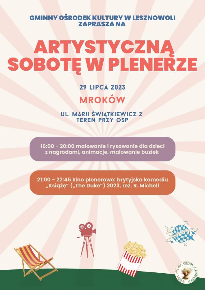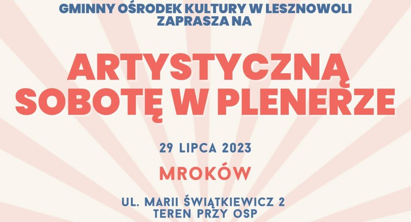 Gminny Ośrodek Kultury w Lesznowoli zaprasza na pierwszą z trzech "Artystycznych sobót w plenerze", będących połączeniem dawnych "Malarskich niedziel" i "Kina plenerowego".