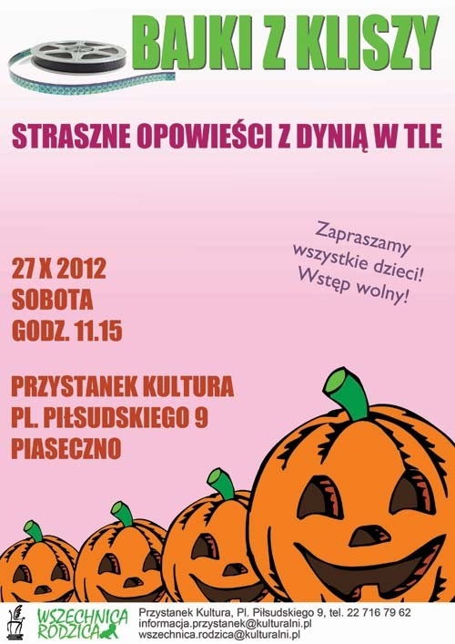 27 października 2012 roku zapraszamy na Bajki z kliszy - Straszne opowieści z dynią w tle. Wstęp wolny. Miejsce: Przystanek Kultura, Plac Piłsudskiego 9 w Piasecznie. Godzina: 11:15. Zapraszamy!