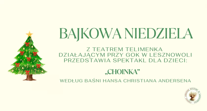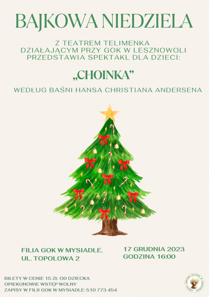 Zapraszamy na Bajkową Niedzielę z Teatrem Telimenka. Spektakl "Choinka" stworzony został na podstawie baśni Hansa Christiana Andersena. Wydarzenie odbędzie się 17 grudnia w filii GOK w Mysiadle przy ulicy Topolowej 2 o godzinie 16:00.