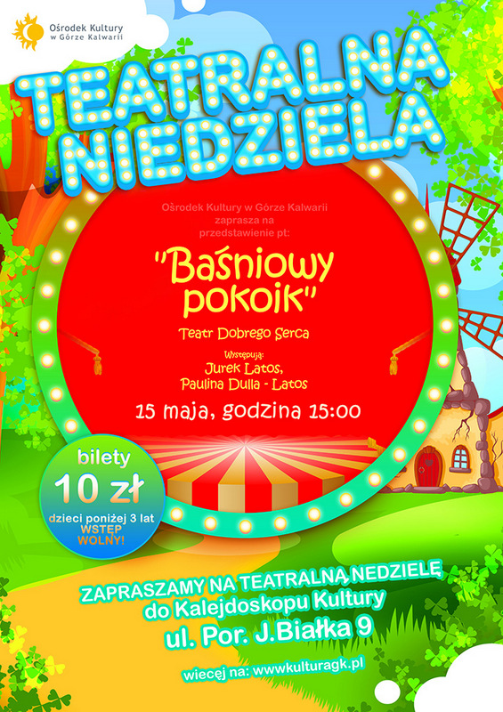 15 maja 2016 r. o godz. 15.00 będzie można obejrzeć spektakl "Baśniowy pokoik" Teatru Dobrego Serca w ramach cyklu Teatralna Niedziela. Miejsce: Ośrodek Kultury w Górze Kalwarii, ul. por. J. Białka 9. Bilety w cenie 10 zł. dostępne godzinę przed spektaklem w kasie OK.