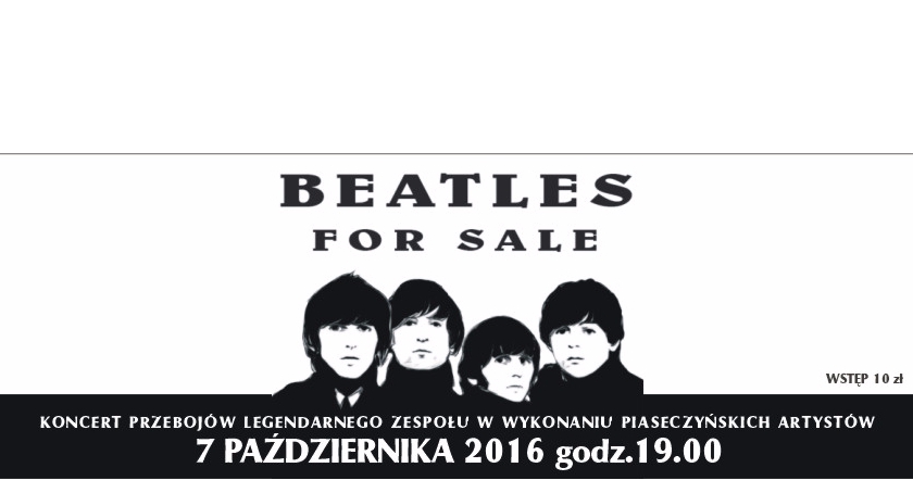 7 października 2016 zapraszamy na koncert przebojów legendarnej Wielkiej Czwórki z Liverpoolu w wykonaniu lokalnych artystów. Koncert rozpocznie się o godz. 19.00 w sali Domu Kultury przy ul. Kościuszki 49 w Piasecznie. Bilety w cenie 10 zł.