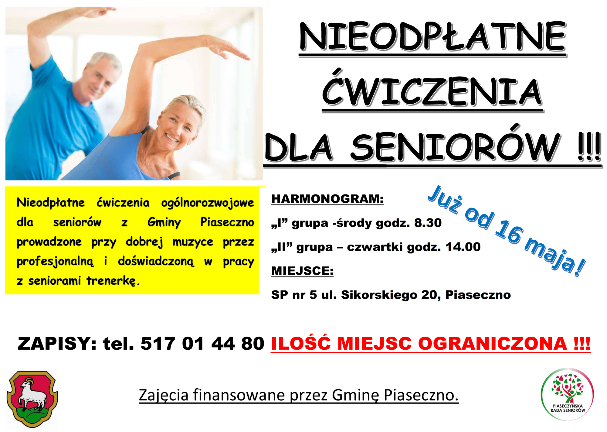 Od 16 maja 2018 roku ruszają nieodpłatne zajęcia gimnastyczne z wykwalifikowanym instruktorem dla posiadaczy Karty Seniora, postulowane przez Piaseczyńską Radę Seniorów. Zajęcia będą odbywać się do końca 2018 r., w hali Szkoły Podstawowej nr 5 przy ul. Sikorskiego 20 w Piasecznie. Ilość miejsc ograniczona. Zapisy pod nr tel.: 517 01 44 80.