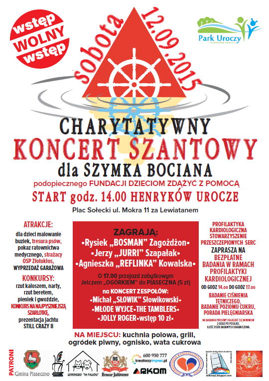 12 września 2015 r. odbędzie się charytatywny koncert szantowy dla Szymka Bociana. Impreza rozpocznie się o godz.14 w Henrykowie Uroczu przy ul. Mokrej 11. W ramach imprezy zaplanowano malowanie buziek, tresurę psów, pokaz ratownictwa medycznego, liczne konkursy, a także bezpłatne badania w ramach profilaktyki kardiologicznej. O godz. 17.00 możliwość przejechania (za 5 zł do Piaseczna i z powrotem) zabytkowym Jelczem "ogórkiem" do Domu Kultury przy ul. Kościuszki 49, gdzie o godz. 18.00 wystąpią prawdziwe gwiazdy wieczoru.