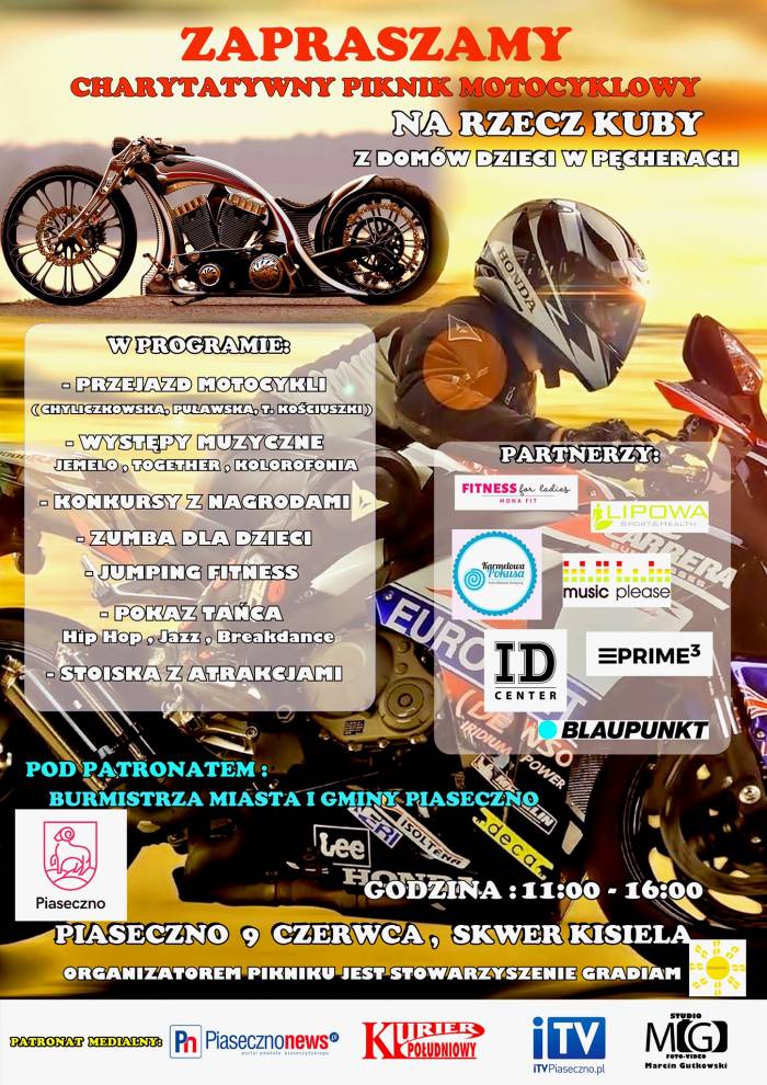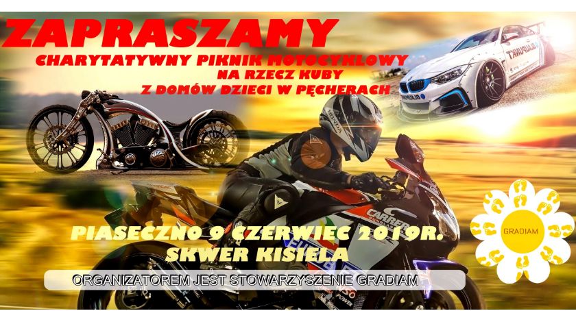 9 czerwca 2019 r. w godz. 11:00-16:00 na Skwerze Kisiela w Piasecznie odbędzie się CHARYTATYWNY PIKNIK MOTOCYKLOWY na rzecz Kuby z Domów Dzieci w Pęcherach.