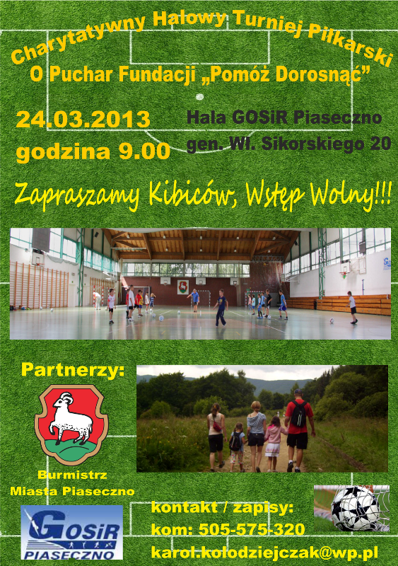 24 marca 2013 roku na hali GOSiR w Piasecznie organizowany jest Charytatywny Halowy Turniej Piłkarski o Puchar Fundacji Pomóż Dorosnąć. Turniej rozpocznie się o godz. 9.00. O Puchar walczyć będzie 16 drużyn. Wstęp wolny! Zapraszamy do kibicowania zawodnikom.
