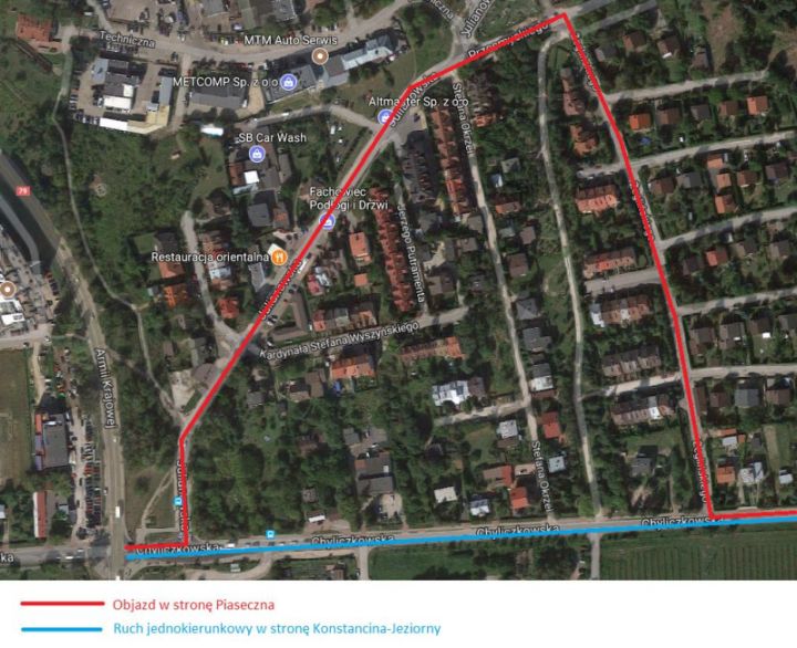 W związku z przebudową ul. Julianowskiej w Piasecznie, od 22 września rano wprowadzony zostaje ruch jednokierunkowy na ul. Chyliczkowskiej, na pasie w stronę Konstancina – na odcinku od ul. Armii Krajowej do ul. Żeglińskiego. Objazd od strony Konstancina do Piaseczna ulicami Żeglińskiego i Julianowską. Objazdem pojedzie również autobus 710. Szczegóły na stronie ZTM: http://www.ztm.waw.pl/rozklad_nowy.php?c=182&l=1&q=710&d=2017-09-22 Za utrudnienia przepraszamy (Starostwo Powiatu Piaseczyńskiego).