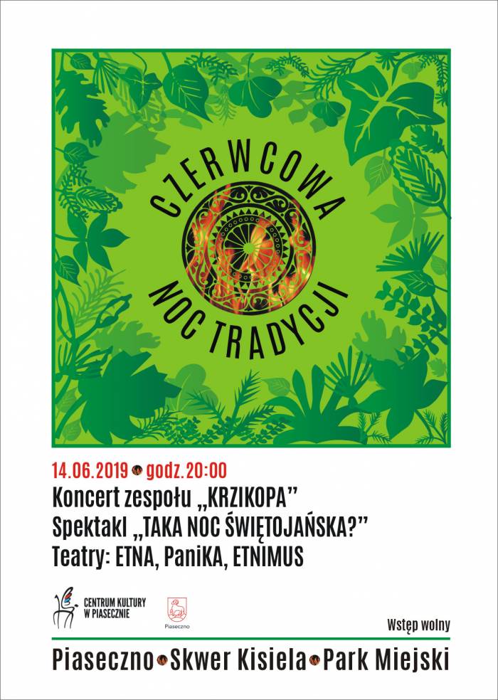 14 czerwca (piątek) o godz. 20:00 odbędzie się CZERWCOWA NOC TRADYCJI. Koncert zespołu Krzikopa. Spektakl TAKA NOC – ŚWIĘTOJAŃSKA? - Teatry ETNA, PaniKA, ETNIMUS. Miejsce: Piaseczno, Skwer Kisiela, Park Miejski. Wstęp wolny.