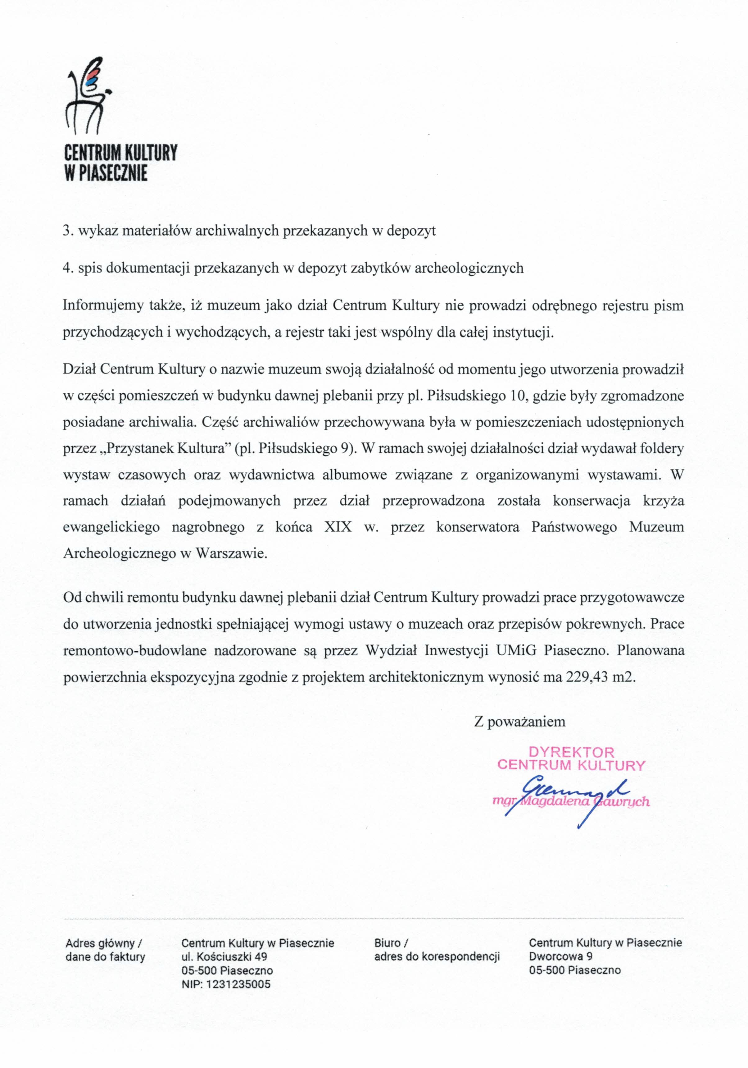 rejestrów zabytków, archiwaliów, fotografii, druków zwartych, czasopism, kartografii, pism przychodzących i wychodzących - prowadzonych przez Muzeum Regionalne w Piasecznie w latach 2004 - do dzisiaj.