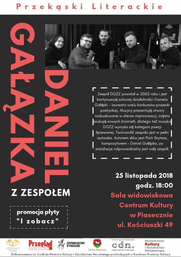 Zbliżamy się do finału naszego smakowitego projektu „Przekąski literackie”. Na deser serdecznie zapraszamy na koncert Daniela Gałązki z Zespołem w dniu 25 listopada o godzinie 18.00 w sali widowiskowej Centrum Kultury w Piasecznie, ul. Kościuszki 49.