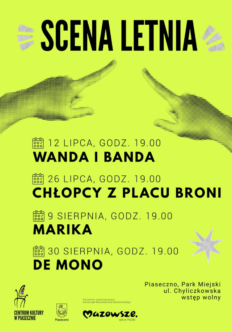 Scena Letnia DE MONO 30 sierpnia (sobota) 2025 roku o godz. 19.00. Wstęp wolny! Miejsce: Park Miejski, Piaseczno.