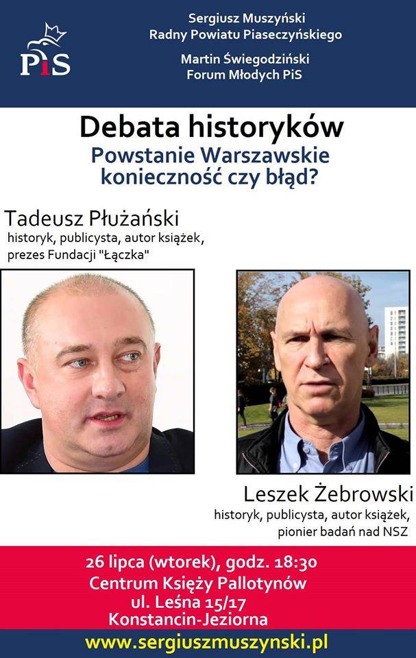 26 lipca (wtorek) o godz. 18:30 w Centrum Księży Pallotynów w Konstancinie-Jeziornie przy ul. Leśnej 15/17 odbędzie się debata dwóch historyków - Tadeusza Płużańskiego oraz Leszka Żebrowskiego - na temat Powstania Warszawskiego. Temat dyskusji: "Powstanie Warszawskie - konieczność czy błąd?".