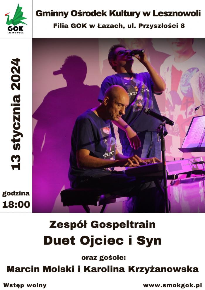 Serdecznie zapraszamy na koncert. Wystąpią Duet Ojciec i Syn, Gospeltrain oraz goście: Marcin Molski i Karolina Krzyżanowska. Wydarzenie odbędzie się 13 stycznia 2024 roku o godzinie 18:00 w filii GOK w Łazach przy ulicy Przyszłości 8. Wstęp wolny!