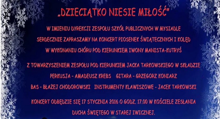Zapraszamy na koncert chóru działającego przy Zespole Szkół Publicznych w Mysiadle. Koncert pt. "Dzieciątko niesie miłość" odbędzie się w niedzielę 17 stycznia o godz. 17.00 w Kościele Zesłania Ducha Świętego w Starej Iwicznej.