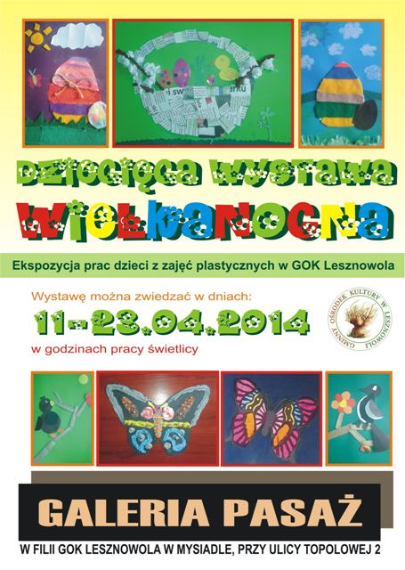 W dniach 11-23 kwietnia 2014 roku będzie można oglądać dziecięcą wystawę wielkanocną. Ekspozycja dziecięcych prac plastycznych powstałych na zajęciach w GOK. Miejsce: Galeria PASAŻ w Mysiadle, ul. Topolowa 2.
