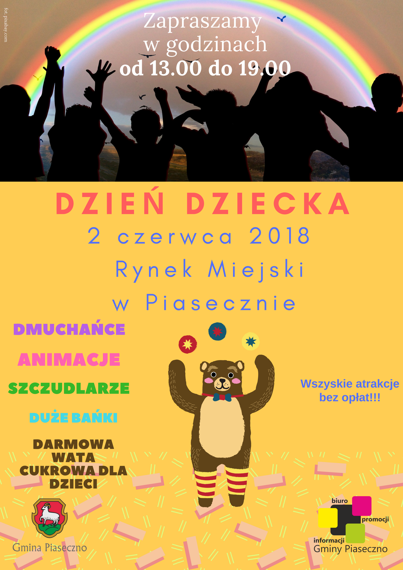 2 czerwca 2018 roku w godzinach od 13.00 do 19.00 zapraszamy dzieci na Rynek Miejski w Piasecznie, gdzie Biuro Promocji i Informacji Gminy przygotowało dla nich bezpłatne atrakcje.