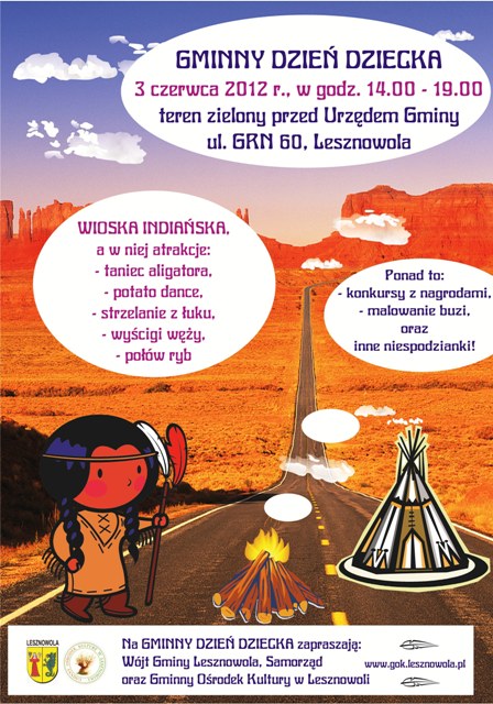 3 czerwca. 2012 r. w godz. 14.00 - 19.00 zapraszamy na wspaniałą zabawę plenerową w prawdziwej, kolorowej, pełnej Indian, preriowych zabaw i super konkursów Wiosce Indiańskiej. Impreza odbędzie się na terenie zielonym przed Urzędem Gminy w Lesznowoli przy ul. GRN 60. Dla naszych milusińskich organizatorzy przygotowali mnóstwo atrakcji: stragany i straganiki, grillowanie, konkursy, słodycze oraz inne niespodzianki! Zapraszamy!
