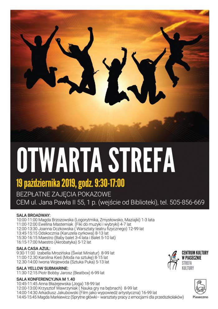 19.10.2019 r. 9:30-17:00 odbędzie się dzień otwarty w Strefie Kultury. Zapraszają na BEZPŁATNE ZAJĘCIA POKAZOWE! Miejsce: CEM ul. Jana Pawła II 55, 1 p. (wejście od Biblioteki).