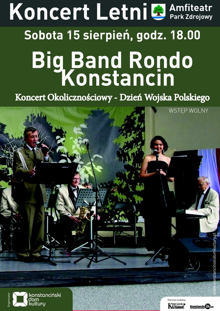 15 sierpnia o godz. 18.00 wystąpi zespół Big Band Rondo Konstancin. Miejsce: Amfiteatr, Park Zdrojowy. Big Band Rondo Konstancin. Podczas koncertu konstancińskiego Big Bandu usłyszymy pieśni patriotyczne i wojskowe z różnych okresów walk o niepodległość. Wstęp wolny.