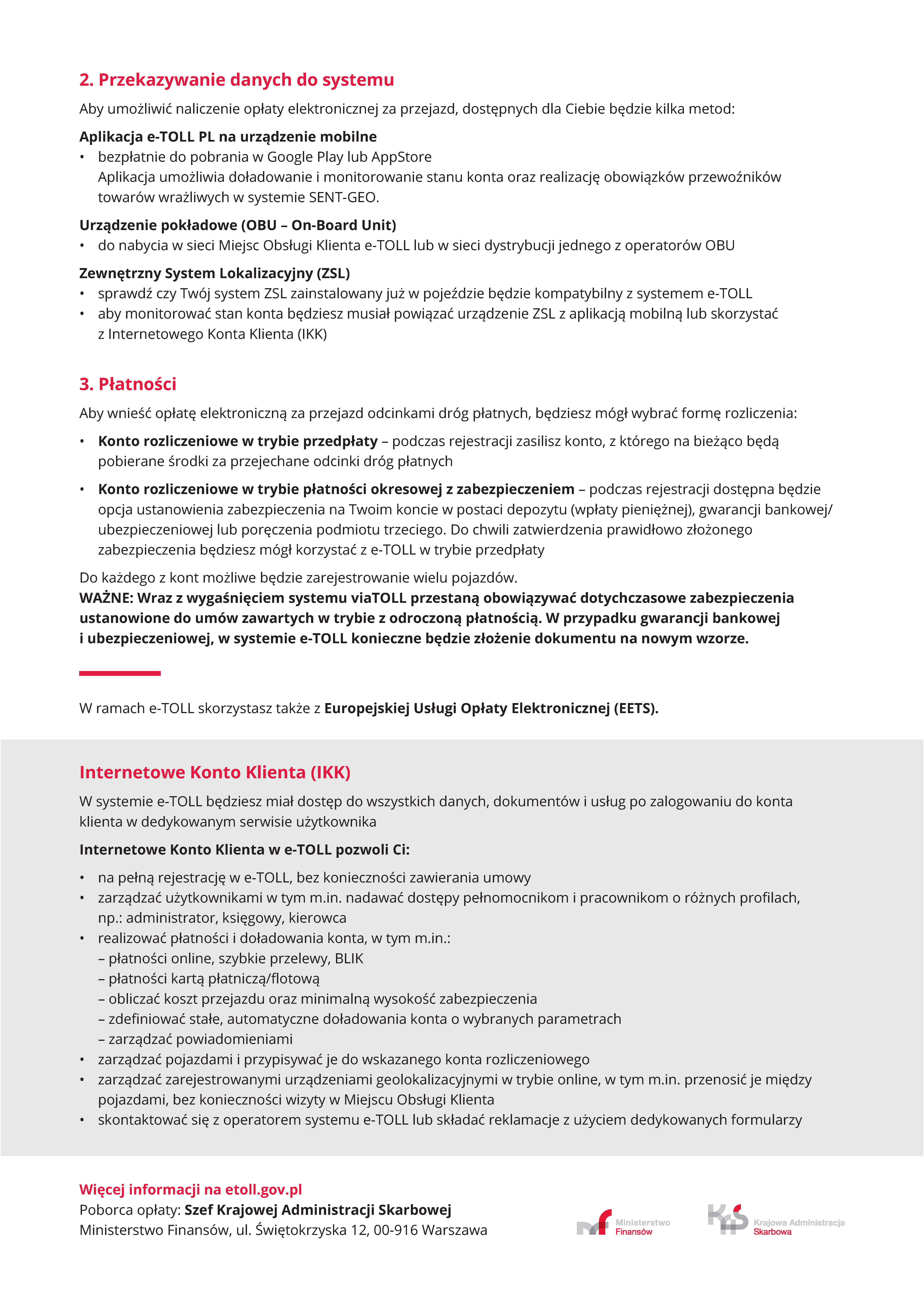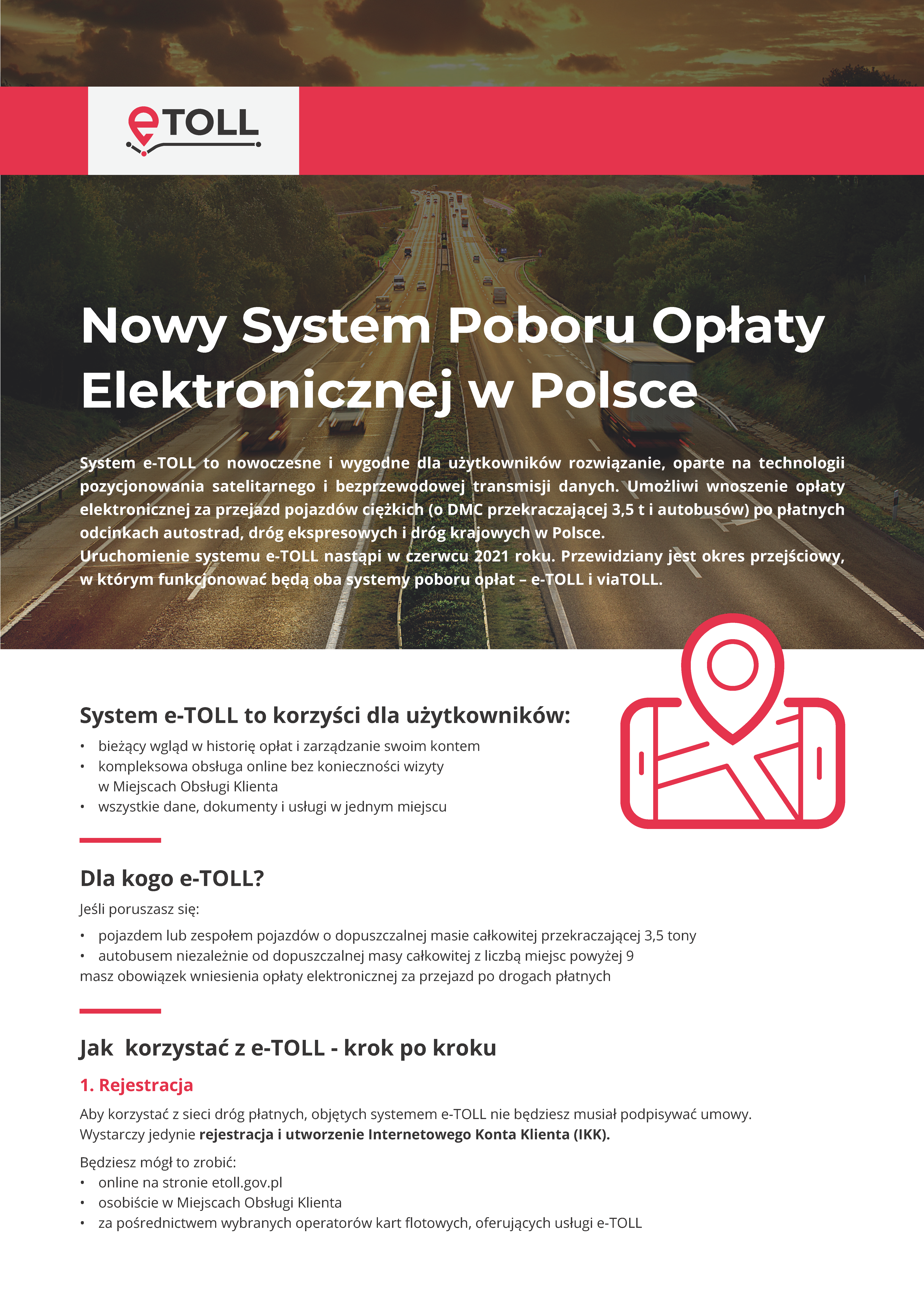 System e-TOLL to nowoczesne i wygodne dla użytkowników rozwiązanie, oparte na technologii pozycjonowania satelitarnego i bezprzewodowej transmisji danych. Umożliwi wnoszenie opłaty elektronicznej za przejazd pojazdów ciężkich (o DMC przekraczającej 3,5 t i autobusów) po płatnych odcinkach autostrad, dróg ekspresowych i dróg krajowych w Polsce. Uruchomienie systemu e-TOLL nastąpi w czerwcu 2021 roku. Przewidziany jest okres przejściowy, w którym funkcjonować będą oba systemy poboru opłat – e-TOLL i viaTOLL.