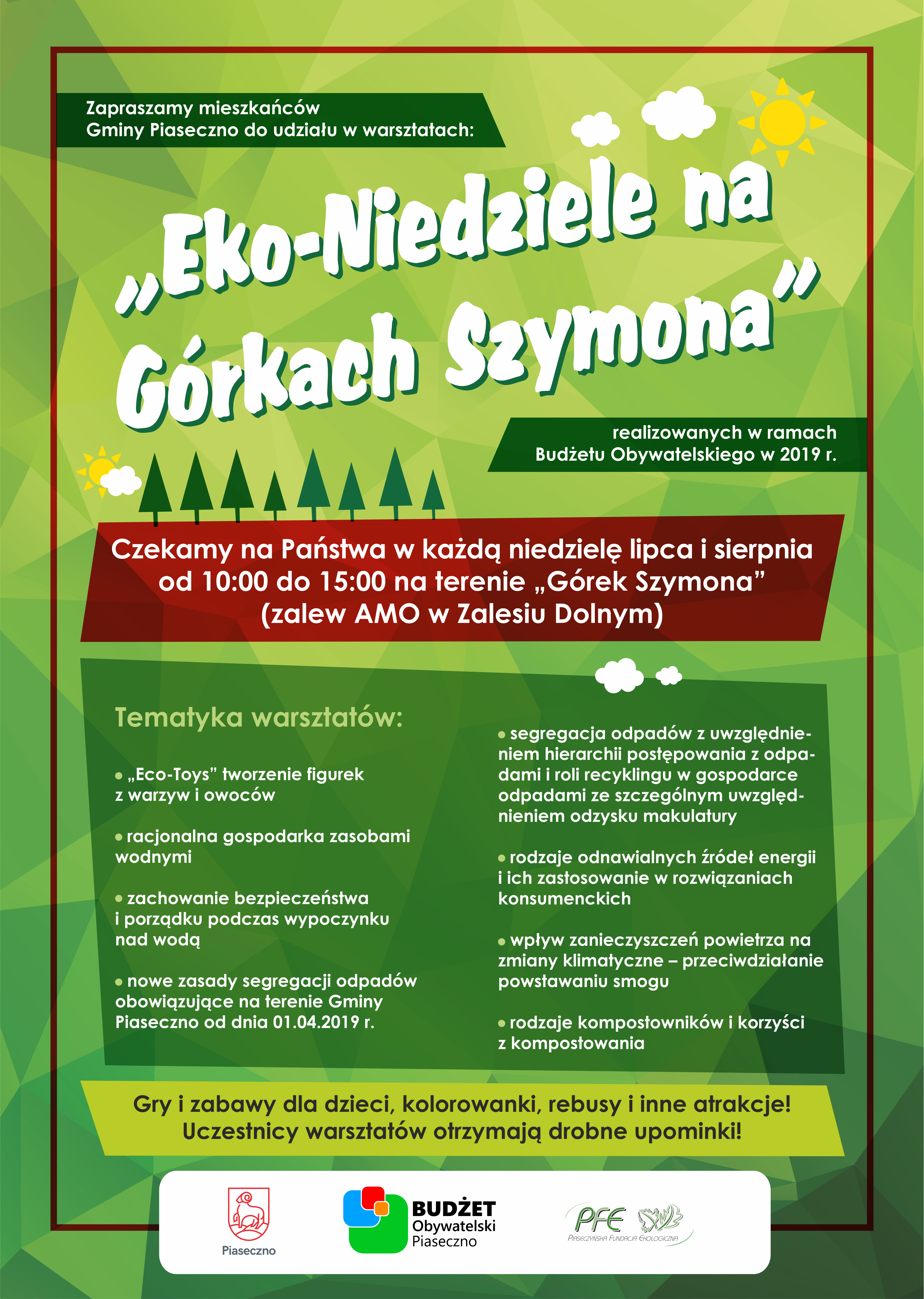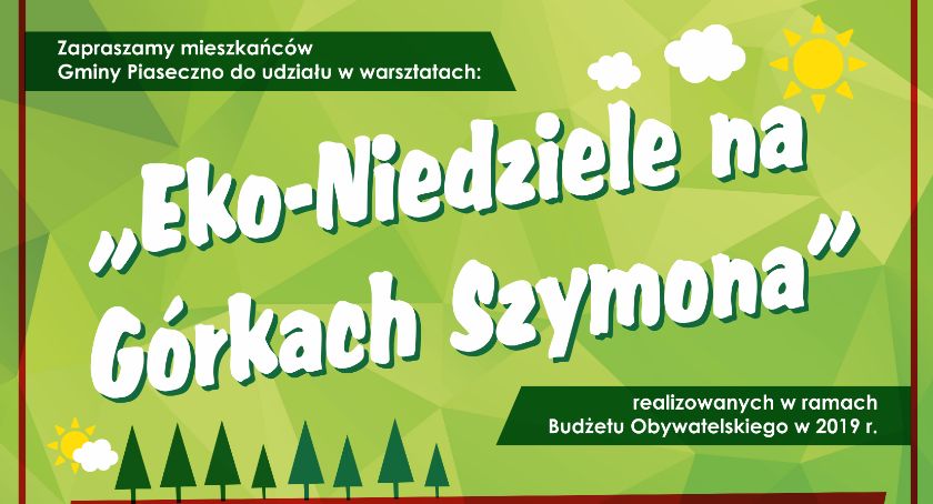 We wszystkie niedziele lipca i sierpnia w godzinach od 10.00 do 15.00 zapraszamy na “Eko-Niedziele na Górkach Szymona”. Projekt realizowany jest w ramach Budżetu Obywatelskiego Piaseczna 2019. W programie warsztaty ekologiczne, zabawy dla dzieci.