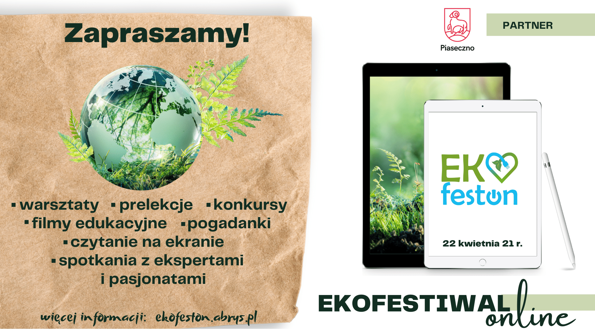 W czwartek 22 kwietnia 2021 r. o godzinie 9.00 zapraszamy do udziałuw pierwszym Ekologicznym Festiwalu Online EKOfeston, organizowanym przez Dział Edukacji Ekologicznej firmy Abrys. Partnerem tego niezwykłego wydarzenia jest Gmina Piaseczno.To jedyne w swoim rodzaju ogólnopolskie i bezpłatne wydarzenie pozwala na wspólne świętowanie Dnia Ziemi w wirtualnej rzeczywistości, ale w trosce o prawdziwe środowisko. Żeby wziąć udział w Festiwalu wystarczy wejść na stronę: ekofeston.abrys.pl lub w serwisie Facebook znaleźć wydarzenie „EKOfeston Ekologiczny Festiwal Online”.