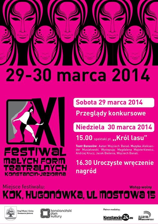 29-30 marca 2014 roku odbędzie się Festiwal Małych Form Teatralnych. Zapraszamy festiwalową publiczność: dzieci, młodzież, rodziców dziadków. Zmagania startujących w XI edycji festiwalu zespołów będzie można ogląd w sobotę 29 marca. W niedzielę 30 marca o 15.00 spektakl dla dzieci "Król Lasu", a po nim wręczenie nagród. Więcej informacji na plakacie.