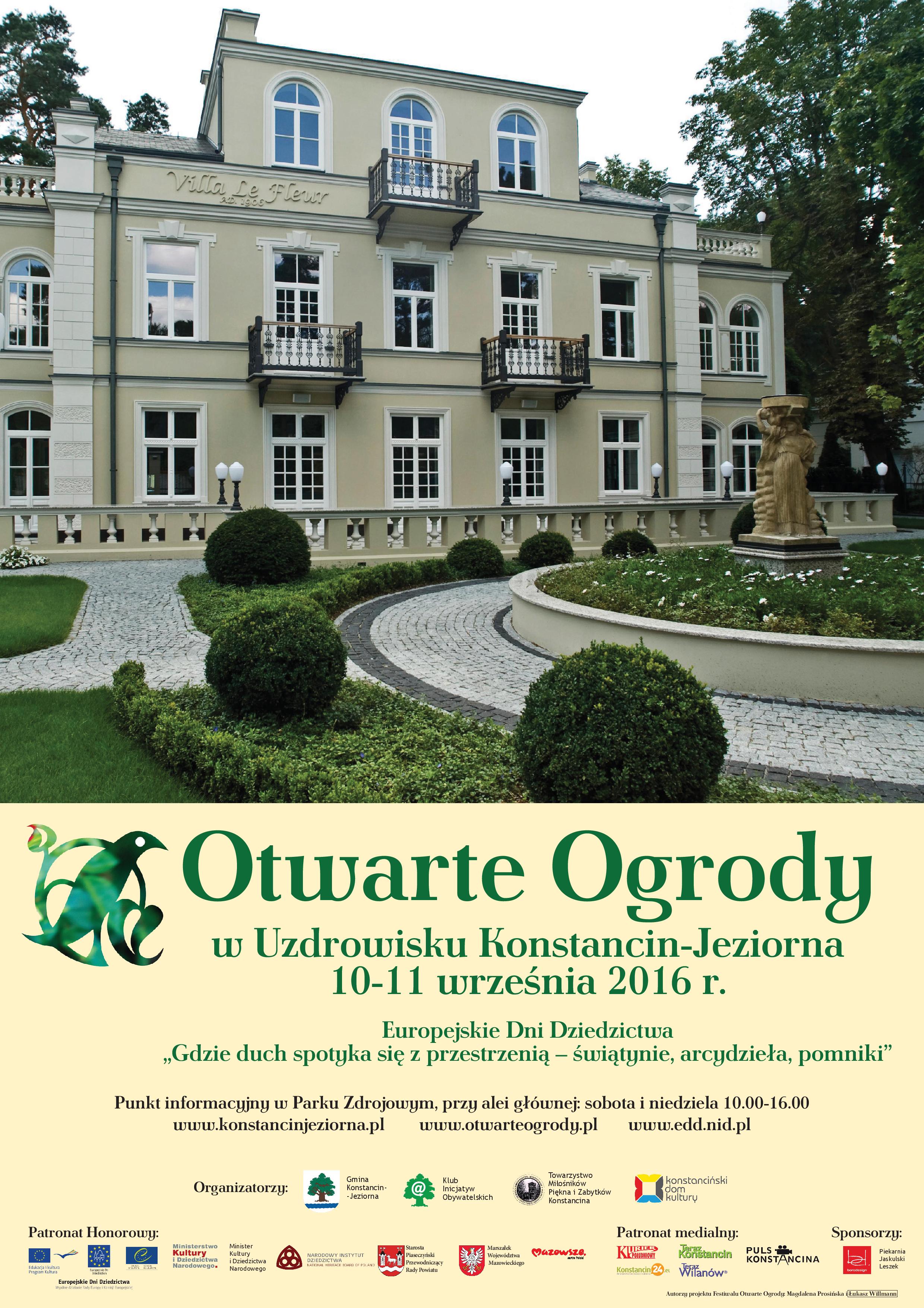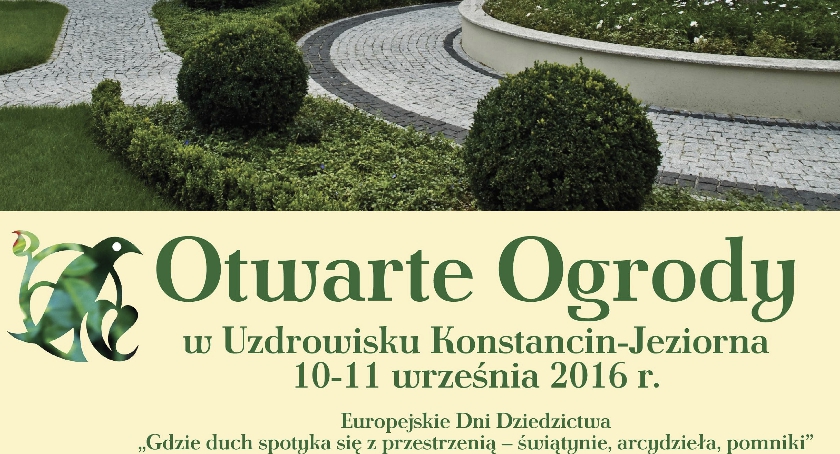 10 - 11 września 2016 roku zapraszamy na Festiwal Otwarte Ogrody do Konstancina. Hasło Europejskich dni Dziedzictwa 2016, w ramach których odbywa się Festiwal Otwarte Ogrody, w tym roku brzmi „Gdzie duch spotyka się z przestrzenią – świątynie, arcydzieła, pomniki.” Mieszkańcy Konstancina-Jeziorny otworzą swoje ogrody dla zwiedzających. W ich malowniczej scenerii będzie można wysłuchać koncertów, obejrzeć liczne wystawy i pokazy, poznać ciekawych ludzi, artystów, a także wziąć udział w warsztatach i wycieczkach po najpiękniejszych zakątkach uzdrowiska.