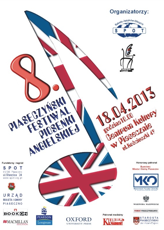 18 kwietnia 2013 roku na deskach Centrum Kultury zaprezentuje się utalentowana, czerpiąca radość ze śpiewu młodzież, która rywalizować będzie między sobą w ramach Piaseczyńskiego Festiwalu Piosenki Angielskiej. Już od godz. 10.00, będzie można usłyszeć melodie zarówno znanych przebojów jak i bardziej kameralnych utworów, oczywiście śpiewanych w języku angielskim. Jury oceniając poszczególne występy brać będzie pod uwagę nie tylko poprawną wymowę i akcent, ale również artystyczne wrażenia. Organizatorem festiwalu jest Szkoła Języków Obcych SPOT wraz z Centrum Kultury w Piasecznie.