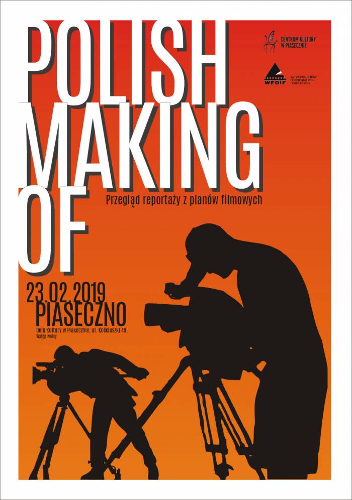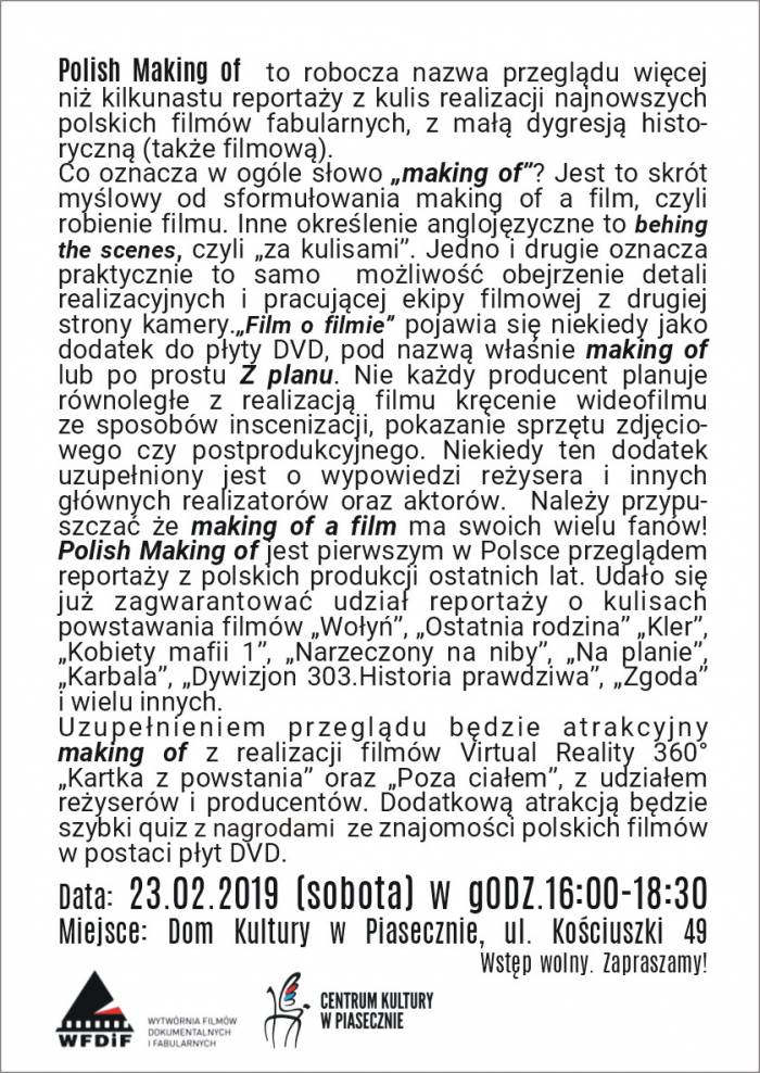 Centrum Kultury w Piasecznie organizuje pierwszy w Polsce przegląd polskich reportaży z planów filmowych o nazwie „POLISH MAKING OF”, który odbędzie się 23.02.2019 r. w sali piaseczyńskiego Domu Kultury, ul. Kościuszki 49. Impreza jest wydarzeniem niekomercyjnym, niebiletowanym i ma charakter edukacyjny.