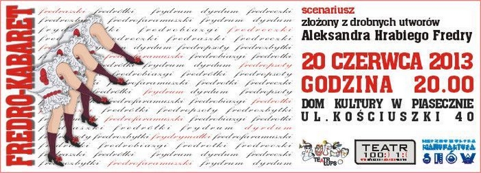20 czerwca 2013 roku o godz. 20.00 zapraszamy na spektakl Fredro - Kabaret, w wykonaniu Teatru ŁUPS!, Teatru Stu Uśmiechów i Jednego Smutku oraz, gościnnie, Teatru Manufaktura Snów. Przedstawienie odbędzie się w sali Domu Kultury w Piasecznie, ul. Kościuszki 49. Wstęp wolny. Zapraszamy na spektakl.