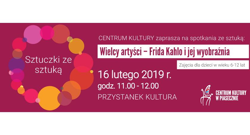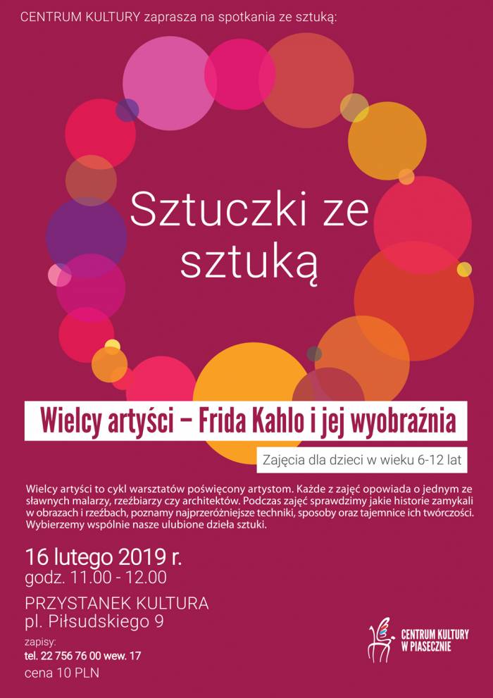 16 lutego 2019 roku o godz. 11.00 odbędą się zajęcia dla dzieci w wieku 6-12 lat pn.: SZTUCZKI ZE SZTUKĄ - Wielcy artyści: Frida Kahlo i jej wyobraźnia. Miejsce: Piaseczno, pl. Piłsudskiego 9 (Przystanek Kultura). Wstęp 10 złotych. Koordynator - Elżbieta Lipska. Na zajęcia obowiązują zapisy: tel. 22 756 76 00