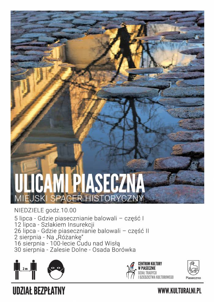 Zapraszamy na cykl spacerów przybliżających historię Piaseczna i okolic, podczas których dowiemy się o wydarzeniach, zabytkach związanych z ulicą, miejscem. Zobaczymy archiwalne zdjęcia, usłyszymy ciekawostki i anegdoty. Udział bezpłatny.