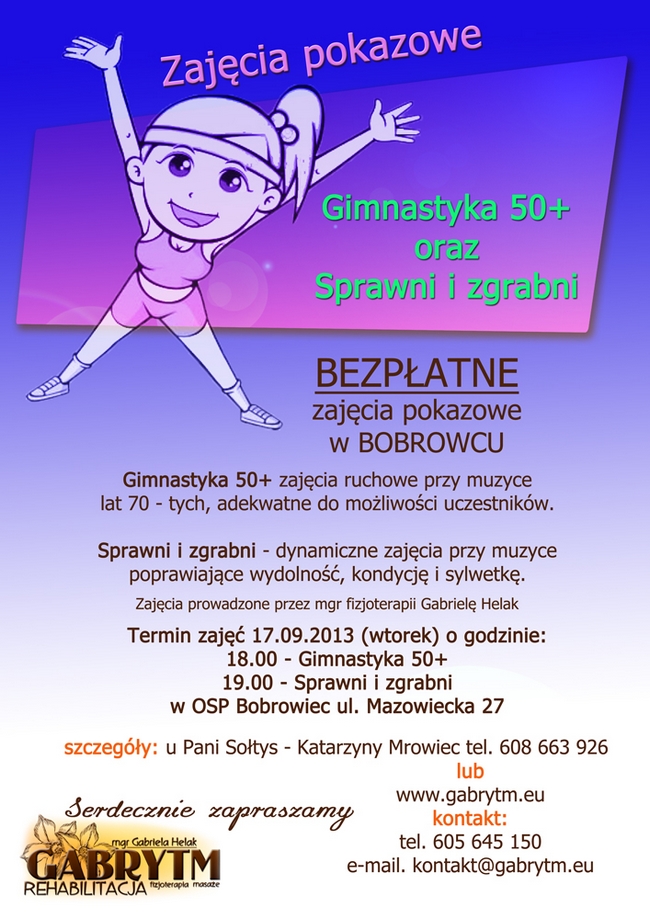 Zapraszamy na bezpłatne zajęcia pokazowe w OSP Bobrowiec, ul. Mazowiecka 27. Termin zajęć - 17 września godz. 18.00 - Gimnastyka 50+ godz. 19.00 - Sprawni i zgrabni. Szczegóły u pani sołtys Katarzyny Mrowiec, tel. 608 663 926