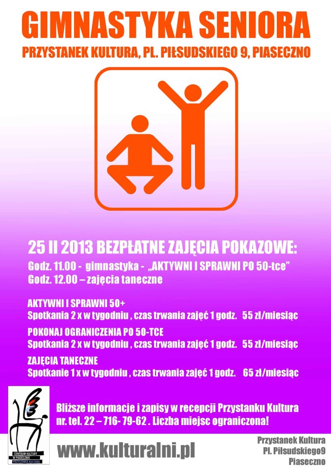 25 lutego 2013 roku zapraszamy Seniorów na pokazowe, bezpłatne zajęcia ruchowe w Przystanku Kultura. Tego dnia o godz. 11.00 będzie można spróbować swoich sił na gimnastyce, a godzinę później rozpoczną się pokazowe zajęcia taneczne. Bliższe informacje i zapisy w recepcji Przystanku Kultura przy Pl. Piłsudskiego 9, tel. 22 716 79 62. Liczba miejsc ograniczona.