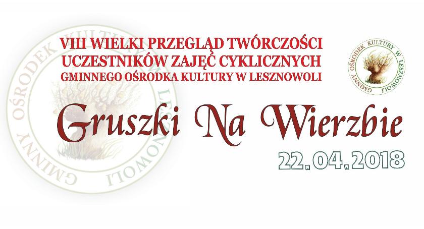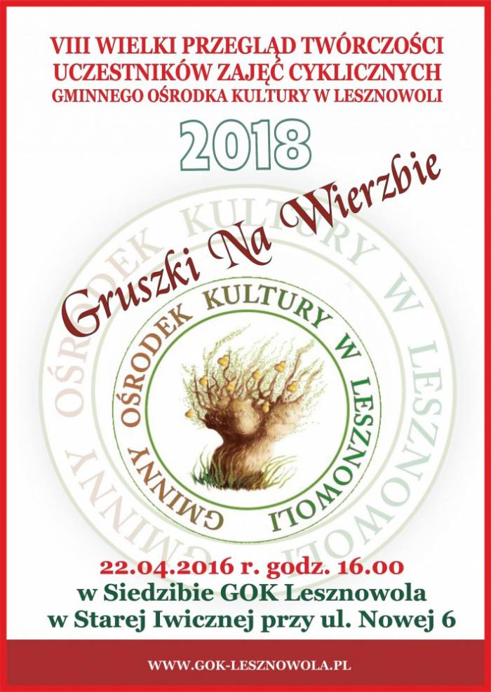 22.04.2018 godz. 16.00 – Wielki Przegląd Twórczości Uczestników Zajęć Cyklicznych w GOK Lesznowola pn. Gruszki Na Wierzbie 2018. Miejsce: siedziba GOK Lesznowola w Starej Iwicznej, ul. Nowa 6.