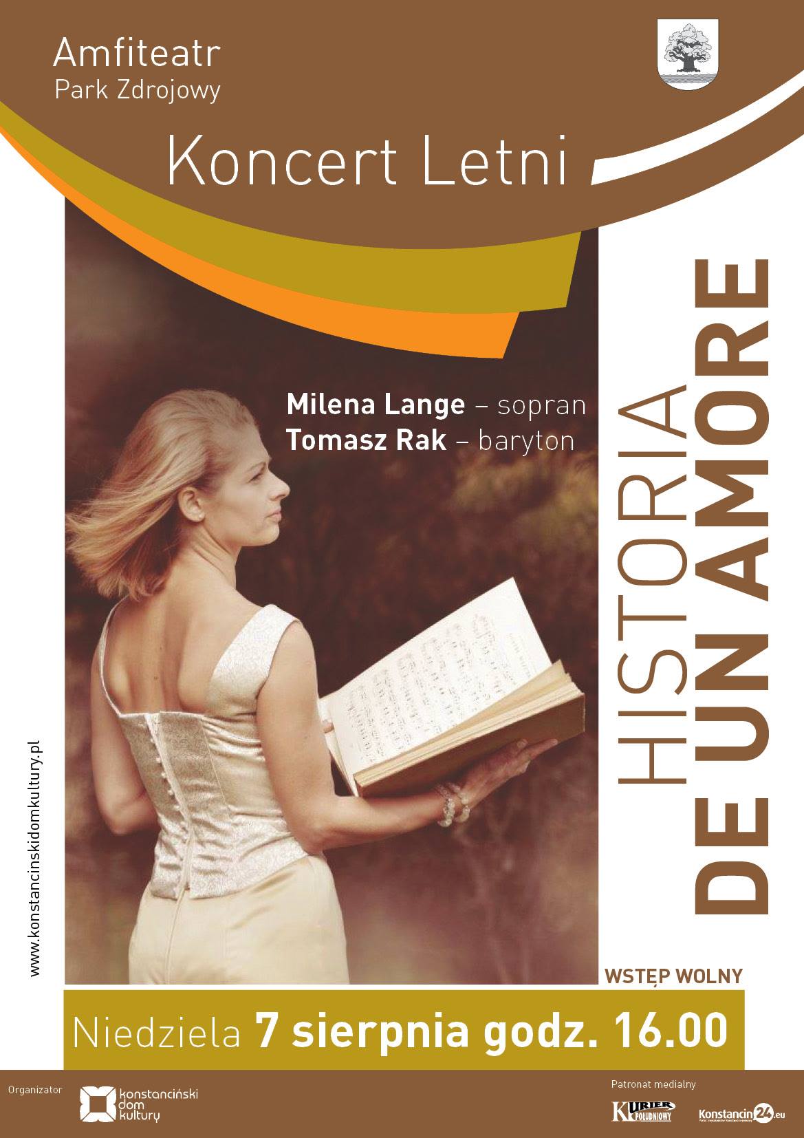 7 sierpnia 2016 r. o godz. 16.00 odbędzie się koncert letni HISTORIA DE UN AMORE w Konstancinie. Najpiękniejsze arie, pieśni, piosenki i duety o miłości z różnych epok, w różnych stylach. W programie między innymi: Besame Mucho, Concierto de Aranjuez, To Były Piękne Dni, Oczy Czarne. Wstęp wolny.