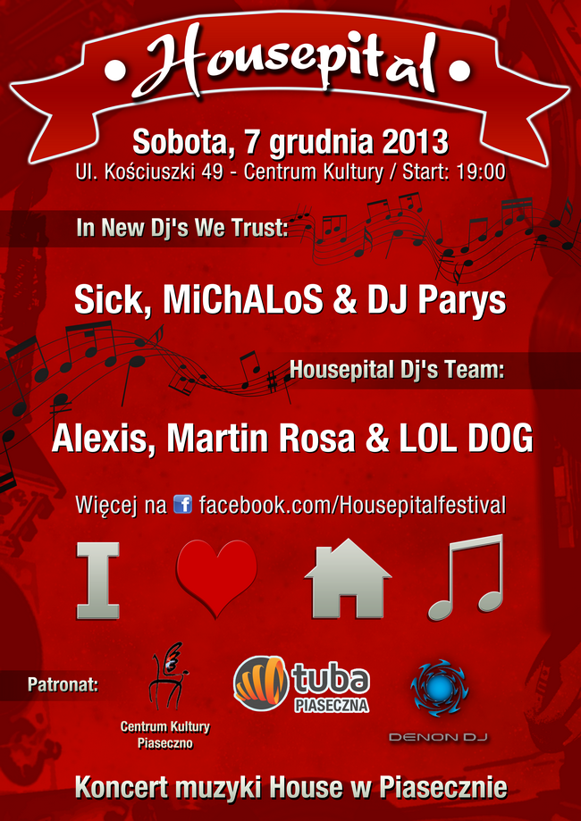 Impreza - Housepital # 7 Dj"e: MiChALoS, Sick, Parys, Martin Rosa, LOL DOG, Alexis. Gdzie: Sala koncertowa Centrum Kultury Piaseczno ul. Kościuszki 49 Wejście: 10zł Kiedy i o której: 7.12.2013 od 19.00 do 23.30 Serdecznie zapraszamy na Housepital!