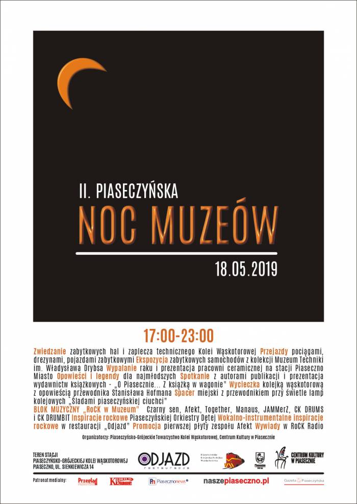 Stacja kolejki to rozległy, industrialny i trochę magiczny teren w samym centrum miasta. Centrum Kultury i Piaseczyńsko-Grójeckie Towarzystwo Kolei Wąskotorowej (PGTKW) uznały, że jest to wprost idealne miejsce na taką imprezę. W programie m.in.: przejazdy kolejką (w tym przejazd z przewodnikiem), spacer historyczny, zwiedzanie terenu kolejki, spotkania autorskie na temat publikacji o Piasecznie, czterogodzinne wydarzenie muzyczne w wykonaniu piaseczyńskich zespołów i orkiestr – RoCK w Muzeum. https://www.kulturalni.pl/kalendarz/event/1356-ii-piaseczynska-noc-muzeow
