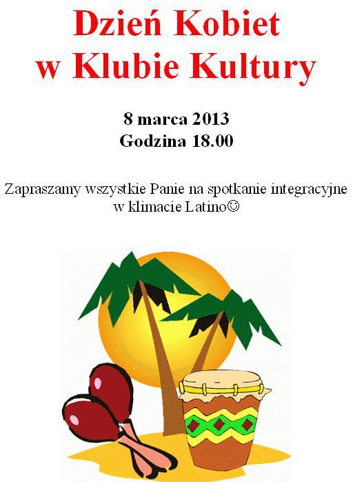8 marca 2013 roku o godz. 18.00 zapraszamy na Dzień Kobiet w Klubie Kultury w Jazgarzewie. Planowana impreza będzie w klimacie Latino.