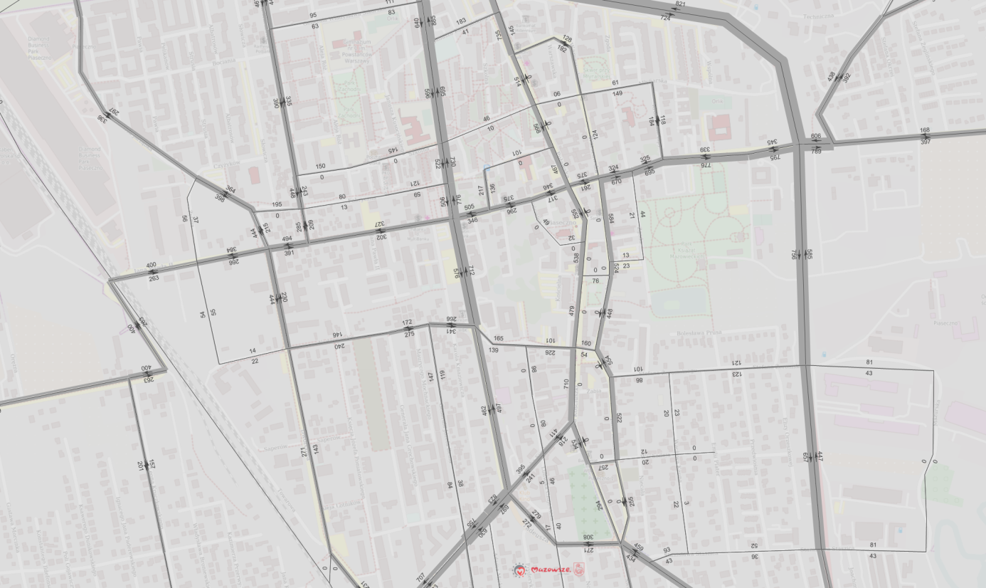 Diagram nr 1. Natężenie ruchu w godzinach popołudniowego szczytu. Grubość szarej linii proporcjonalna do natężenia ruchu.